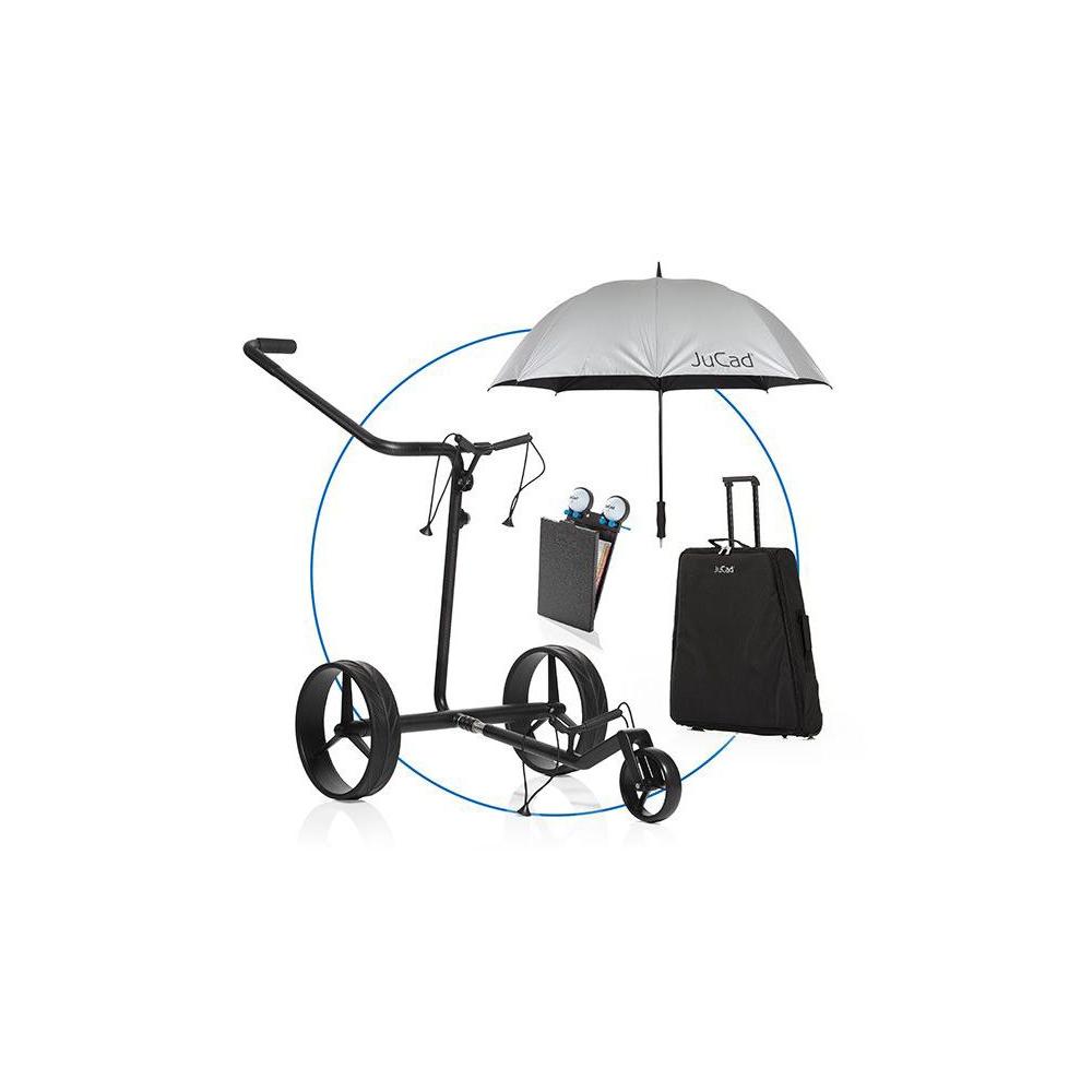 Der JuCad Carbon Drive Classic 3.0 mit dem leicht schimmernden Vollcarbon-Rahmen im matt-schwarzen 3K-Design zeichnet sich durch seine bedienerfreundliche Technik und hochwertige Verarbeitung aus. Nach der Golfrunde ist er mit wenigen Handgriffen schnell und flach zerlegt und kann in der Caddybox oder im Kofferraum verstaut werden. Praktisches Zubehör inklusive.