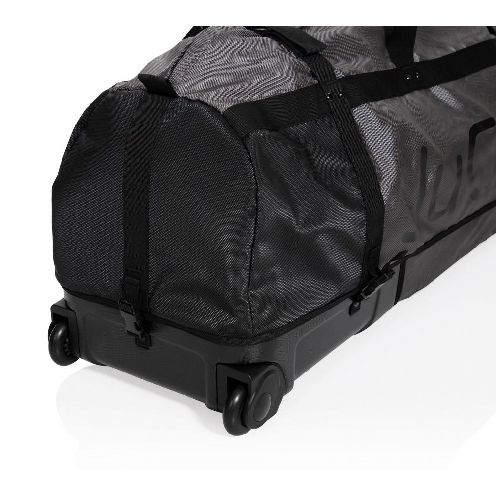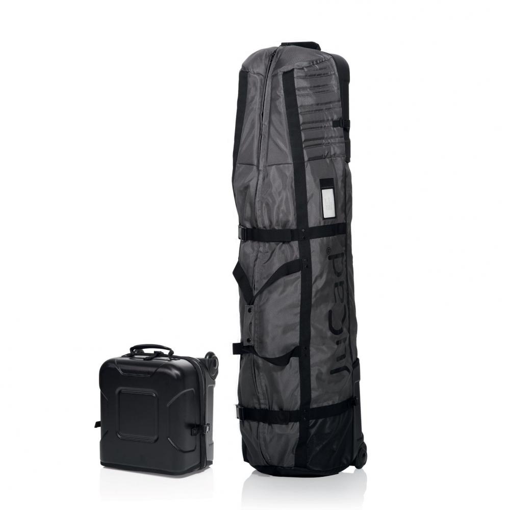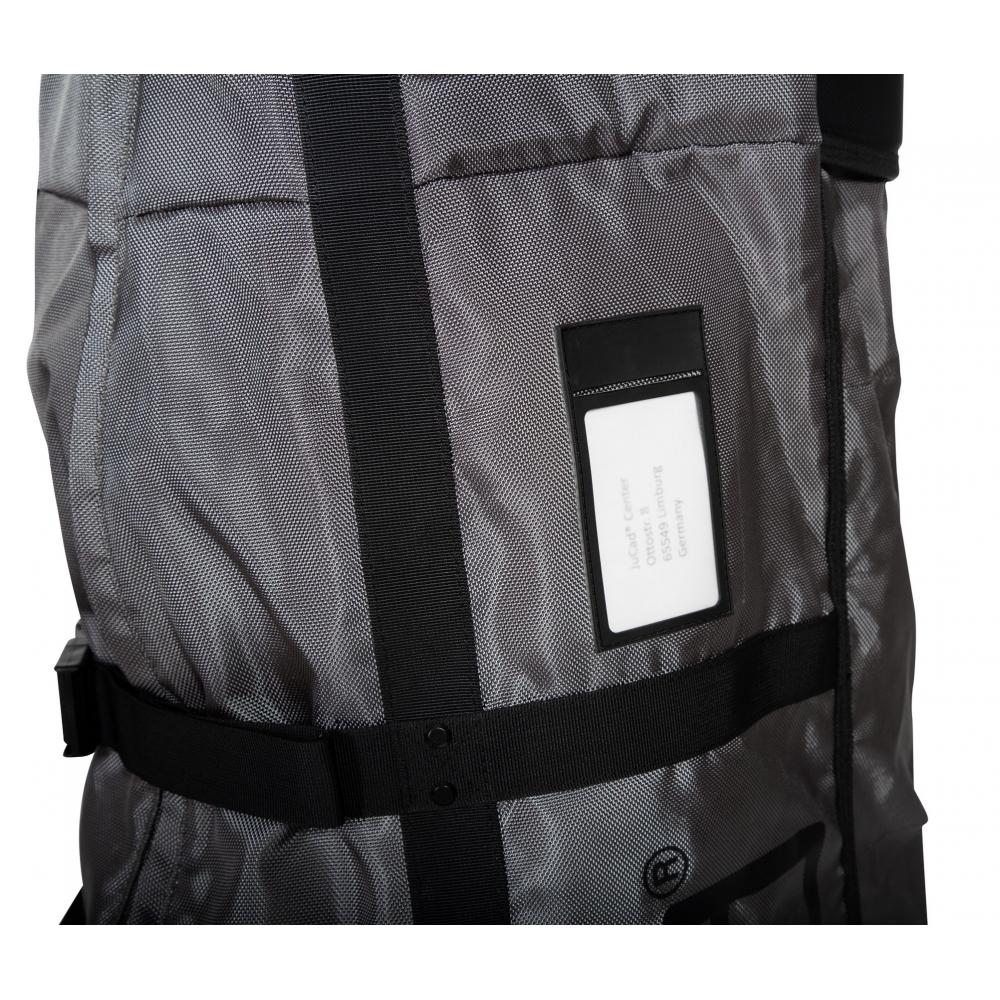Mit Polsterung und festen Hartschalen im oberen und unteren Bereich, innenliegenden Reißverschlusstaschen für Caddyräder und Rahmenteile, verstärkter Rückwand und zwei leichtlaufenden Rollen, Gummigriff und ein Fenster für Namen und Adresse.