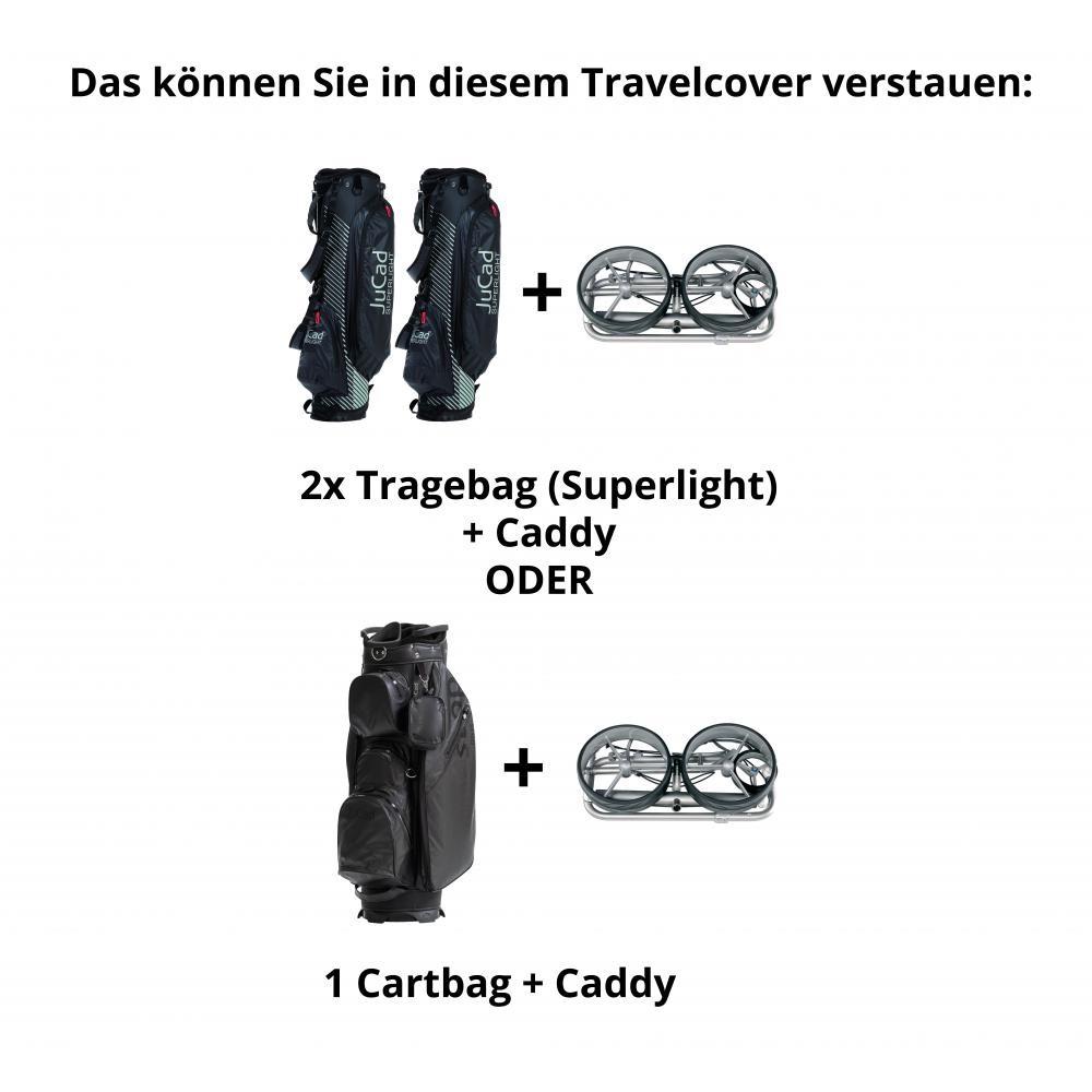 Zur Unterbringung von 1 Cartbag (z.B. JuCad Style) und 1 JuCad Trolley oder 2 Tragebags (z.B. JuCad Superlight) und 1 JuCad Trolley oder 2 Tragebags (z.B. JuCad 2 in 1 Waterproof oder Fly). Trolleyfach passend für alle manuellen JuCad Trolleys und JuCad Elektrotrolleys mit Mini-Packmaß 65x35x15cm.