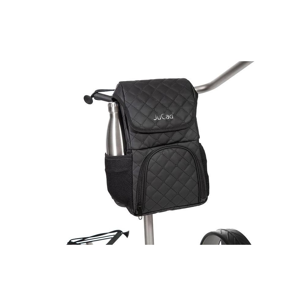 In der elegant gesteppten Anhängetasche für alle JuCad Golfcaddys können Golfzubehör und Wertsachen in zwei unterteilten Fächern untergebracht werden. Im oberen Bereich befindet sich ein zusätzliches Fach mit Reißverschluss, im unteren Bereich sorgt ein extra Kühlakkufach für kalte Getränke.