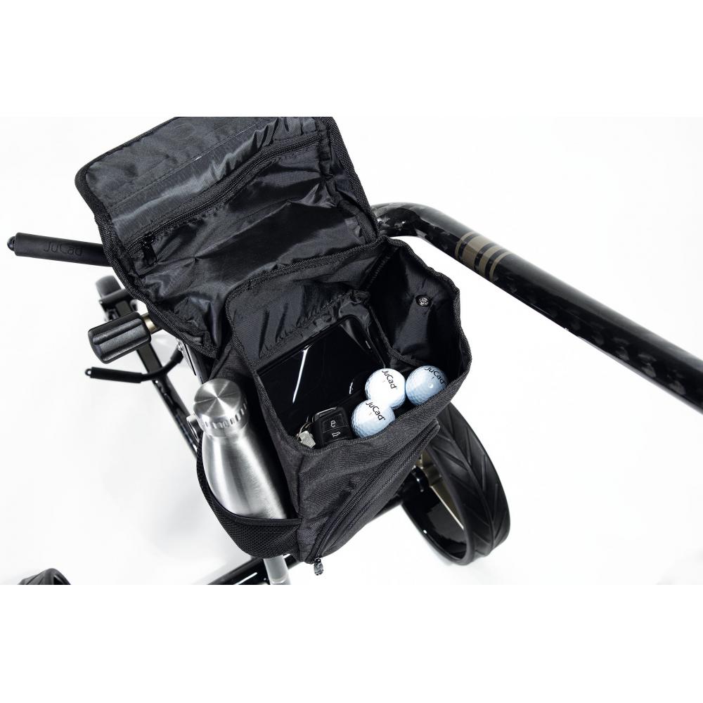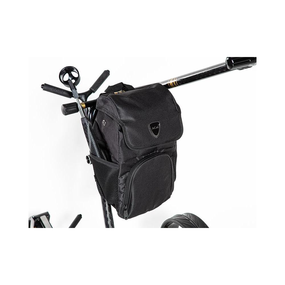 In der praktischen Anhängetasche für alle JuCad Golfcaddys können Golfzubehör und Wertsachen in zwei unterteilten Fächern untergebracht werden. Im oberen Bereich befindet sich ein zusätzliches Fach mit Reißverschluss, im unteren Bereich sorgt ein extra Kühlakkufach für kalte Getränke. Dank Rucksack-Riemen kann das Smartbag bequem mitgenommen werden.