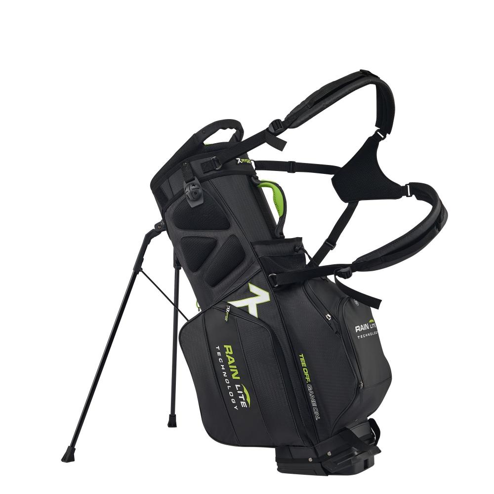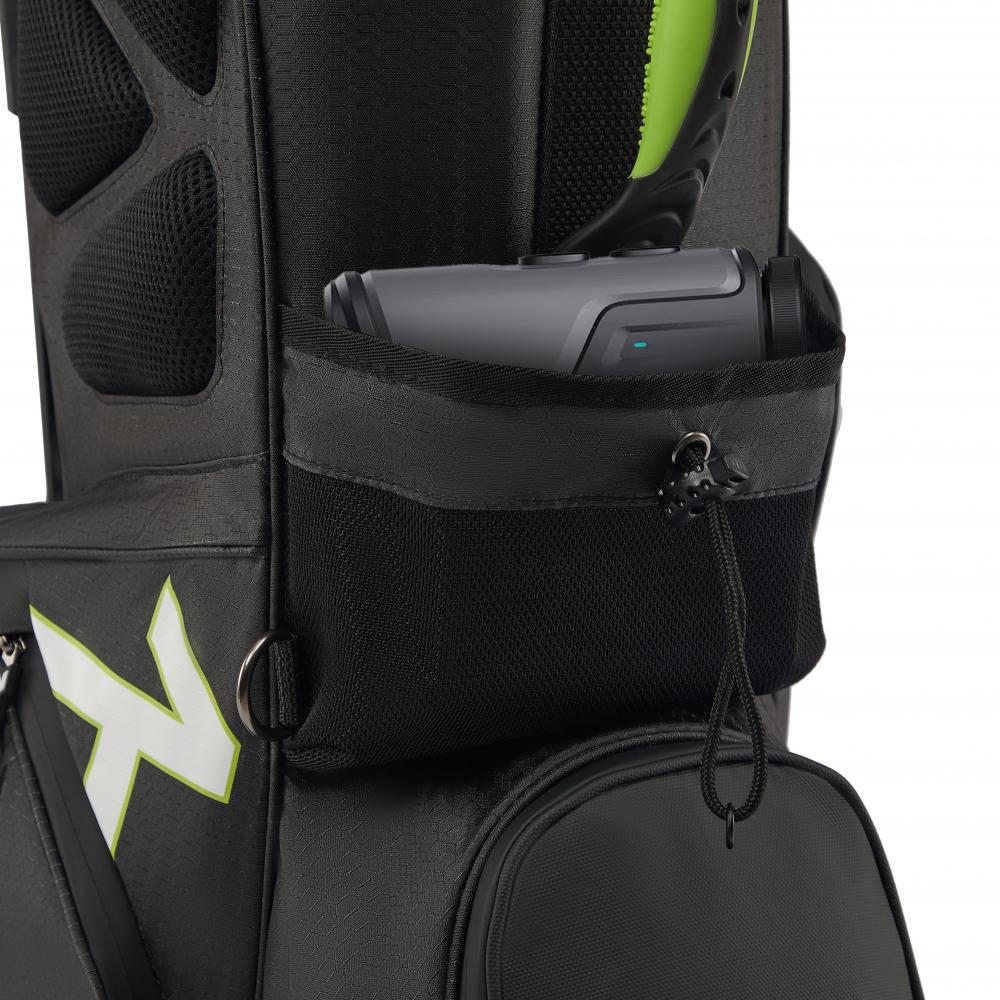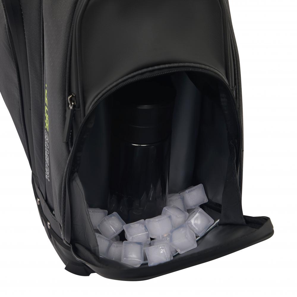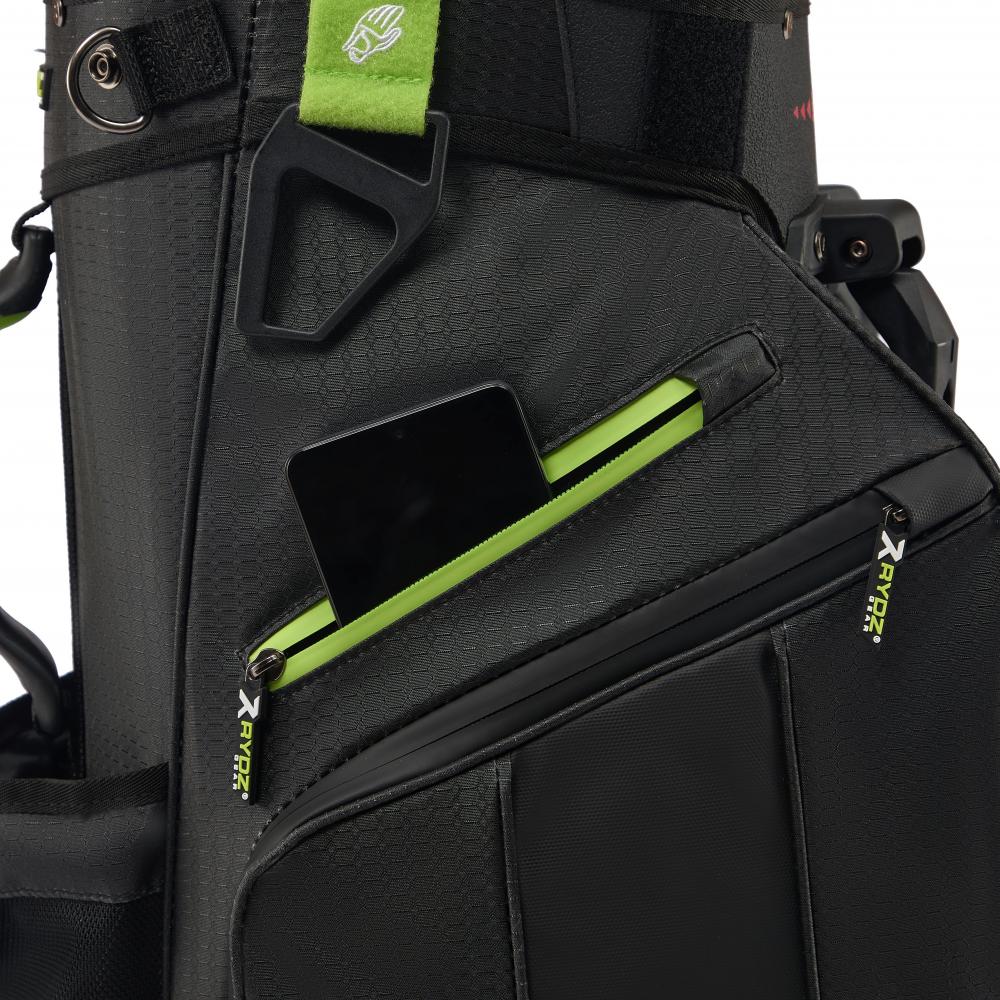 Das Rydz Gear Water Resistant 2 in 1 Hybrid Standbag Jetpack mit wasserabweisender Oberfläche und übersichtlicher Organisation im 14-Way-Mesh-Divider Top mit durchgehenden Unterteilungen zum Schutz der Schlägerschäfte und TPR-Einlage für besondere Schaftschonung.