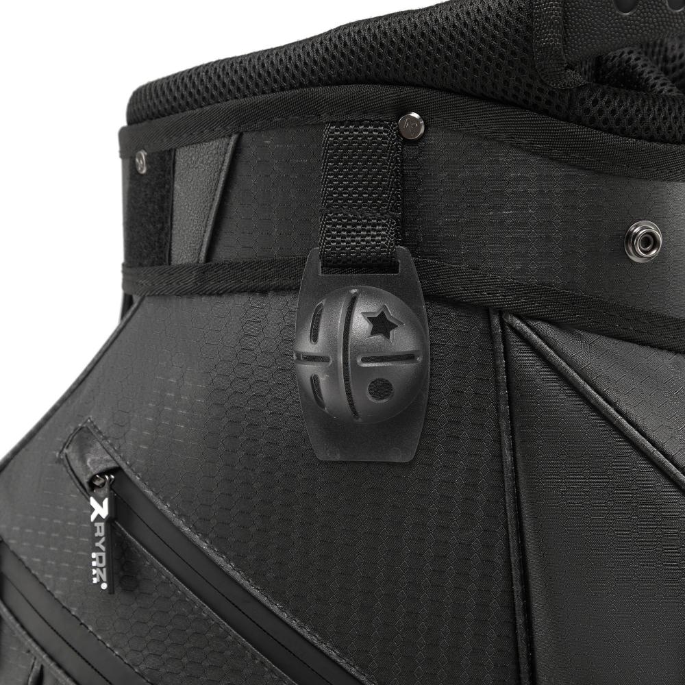 Das Rydz Gear Water Resistant Cartbag Firebee mit wasserabweisender Oberfläche und übersichtlicher Organisation im 14-Way-Mesh-Divider Top mit durchgehenden Unterteilungen zum Schutz der Schlägerschäfte.