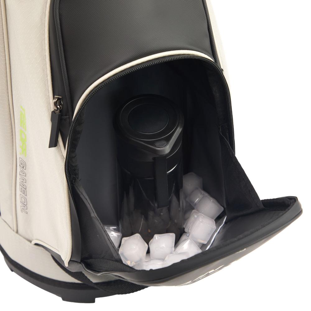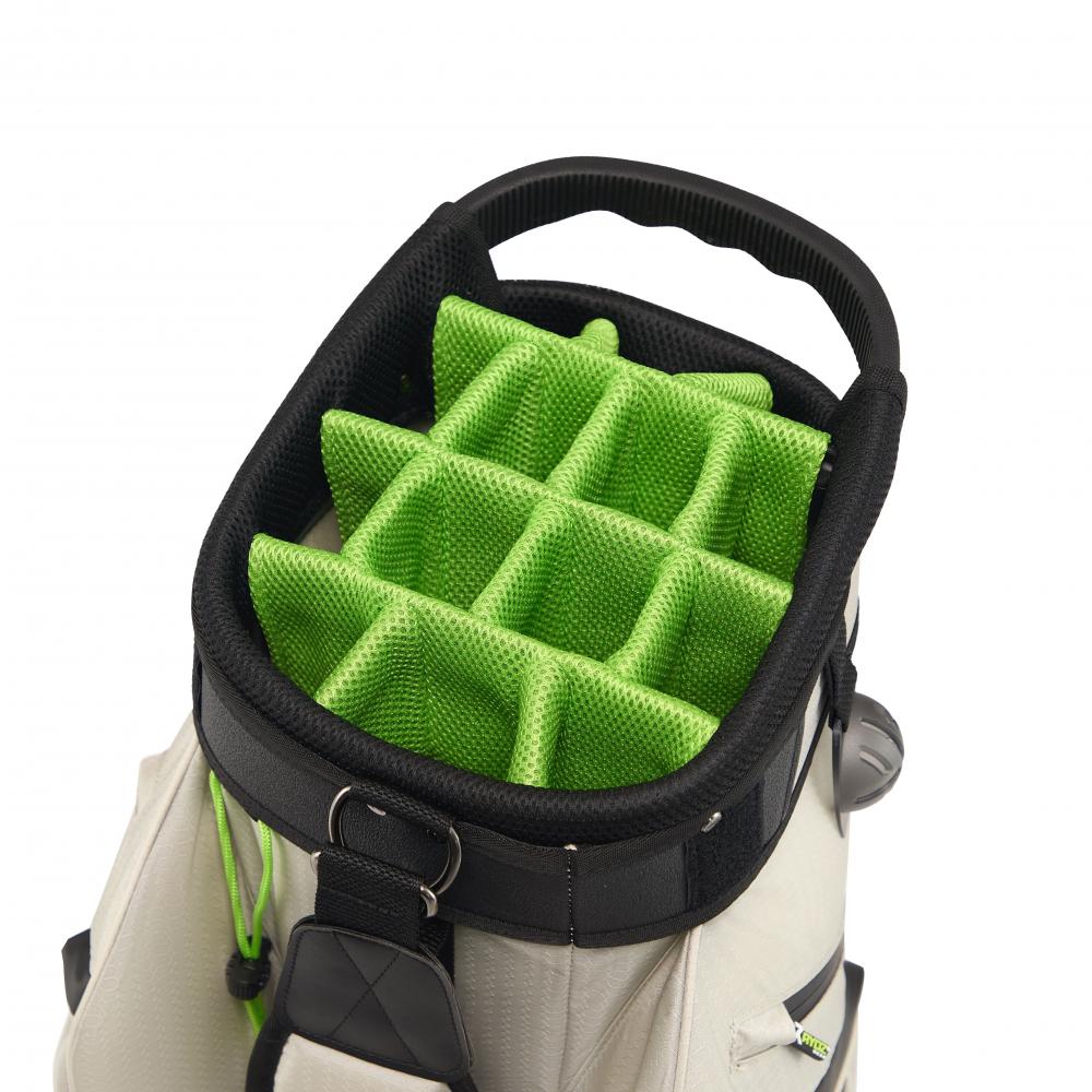 Das Rydz Gear Water Resistant Cartbag Firebee mit wasserabweisender Oberfläche und übersichtlicher Organisation im 14-Way-Mesh-Divider Top mit durchgehenden Unterteilungen zum Schutz der Schlägerschäfte.